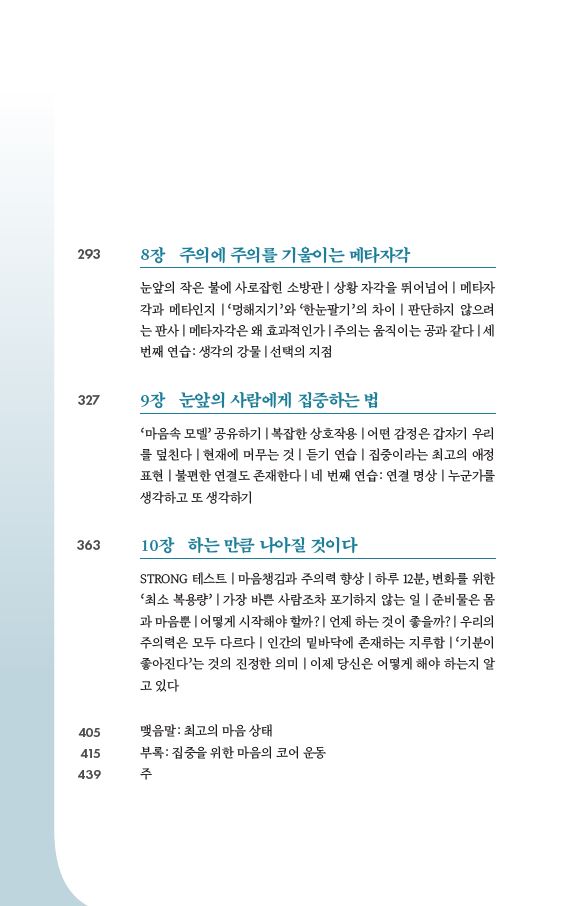 게다가 우리의 주의력은 외부의 자극뿐 아니라 스트레스나 나쁜 기분에도 무척 취약하다. 이때 주의력을 회복하기 위해 많은 사람이 ‘긴장을 풀어주는 활동’이나 ‘긍정적인 사고’와 같은 전략을 택하지만, 저자는 이 방법들이 오히려 우리의 주의력을 갉아먹는 실패한 전략이라고 말한다. 스트레스 상황을 극복하기 위해 더 많은 인지 자원을 소모하게 되면서, 눈앞의 과제에 집중하는 데 써야 할 주의력을 다른 곳에 써버리는 악순환에 빠진다는 것이다. 저자는 이 밖에도 신경과학이 밝혀낸 주의력의 놀라운 특성들을 설명하며 우리의 주의력 시스템이 어떻게 작동하고 어떻게 고갈되는지, ‘주의’에 주의를 기울이는 메타자각이 왜 중요한지, 우리가 가진 마음의 편향이 주의력에 어떠한 악영향을 미치는지 주의력에 관한 뇌과학의 최전선으로 우리를 안내한다.