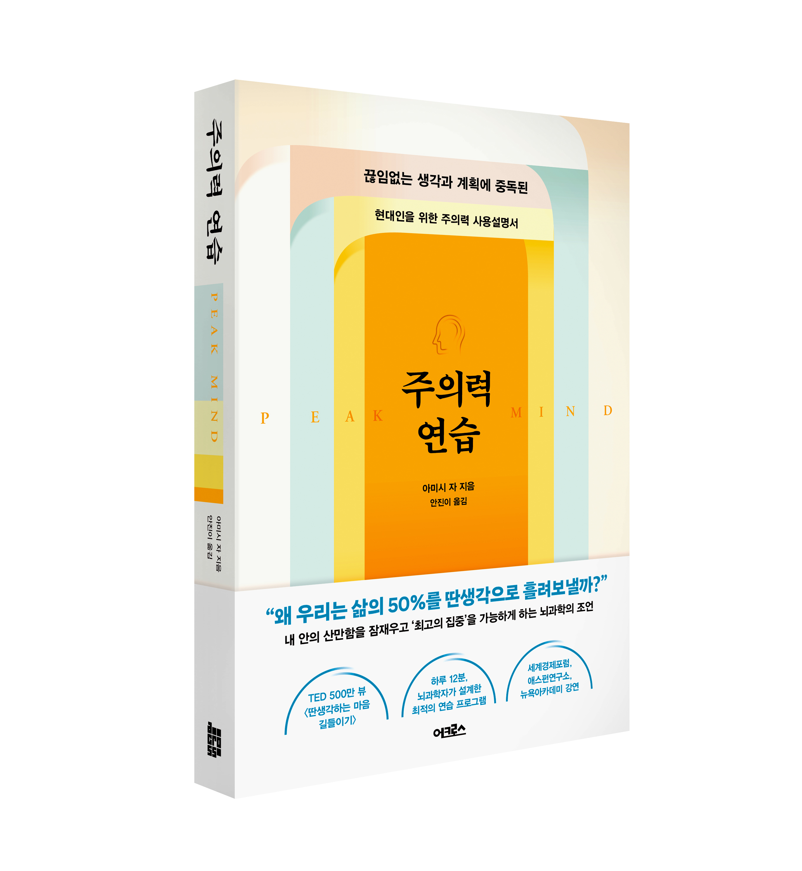 아미시 자는 우리의 주의가 어디로 가 있는지 알아차릴 수 있는 ‘수용적 주의력’과 원하는 곳에 주의를 집중할 수 있는 ‘집중적 주의력’의 두 상태를 능숙히 오가게 될 때, “우리가 인간으로서 마주해야 하는 모든 것을 직면하면서 온전한 삶을 살 수 있는 최고의 마음(peak mind) 상태”에 도달할 수 있다고 말한다. 눈앞의 과제에 집중할 수 있게 하는 과학적 조언을 넘어서, 스트레스와 불안 속에서도 흔들리지 않고 현재를 직시하는 힘을 기르게 하는 이 책 《주의력 연습》이 당신의 주의를 빼앗아 가는 것들로부터 당신을 지킬 가장 과학적이고 효과적인 도구가 되어줄 것이다.