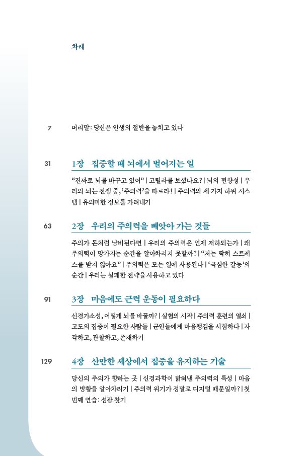 신경 써야 할 것도, 해야 할 일도 너무 많은 시대. 우리는 중요한 일을 눈앞에 두고도 당장 처리할 필요가 없는 일이나 자극적인 뉴스, 쇼핑 목록 같은 것들에 쉽사리 주의를 빼앗기고 만다. 문제는 시시한 일에 주의력을 빼앗긴 만큼 정작 중요한 일에 주의를 기울일 수 없다는 점이다. 그렇다면 우리가 원하는 곳에 주의를 집중하기 위해서 어떻게 해야 할까?