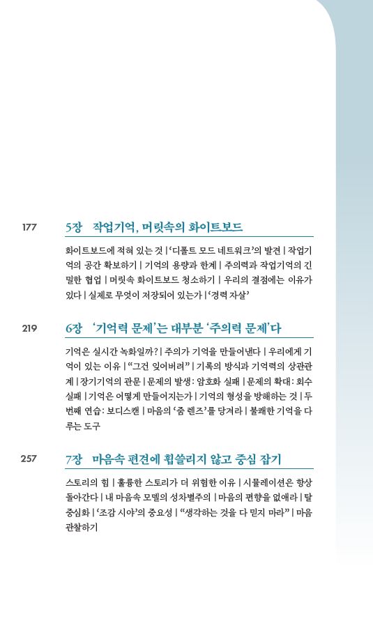 현대사회는 우리에게 동시에 여러 역할을 요구한다. 우리는 머릿속에서 지금 해야 할 일과 그다음 할 일을 끊임없이 생각하고, 계획을 수정해 나간다. 이때 주의력만큼 중요한 것이 바로 ‘작업기억’이다. 작업기억은 우리가 받아들인 정보를 처리할 수 있는 임시 작업 공간으로 주의력의 긴밀한 협업 파트너이다. 저자는 작업기억을 ‘머릿속의 화이트보드’에 비유하는데, 주의력이 바로 이 화이트보드에 무엇을 적을 것인지를 결정한다. 우리는 실제로 일어났던 모든 일을 기억하는 것이 아니라 머릿속 화이트보드에 적은 것들만 기억하는 것이다. 그리고 이 기억들이 곧 우리 삶의 조각조각을 만들어낸다. 이 책에서 제안하는 ‘섬광 찾기’ ‘보디스캔’ ‘생각의 강물’ 같은 구체적인 마음챙김 훈련법은 머릿속의 화이트보드를 깨끗이 청소하고, 화이트보드에 적혀 있는 것이 무엇인지 알아차리도록 만든다.