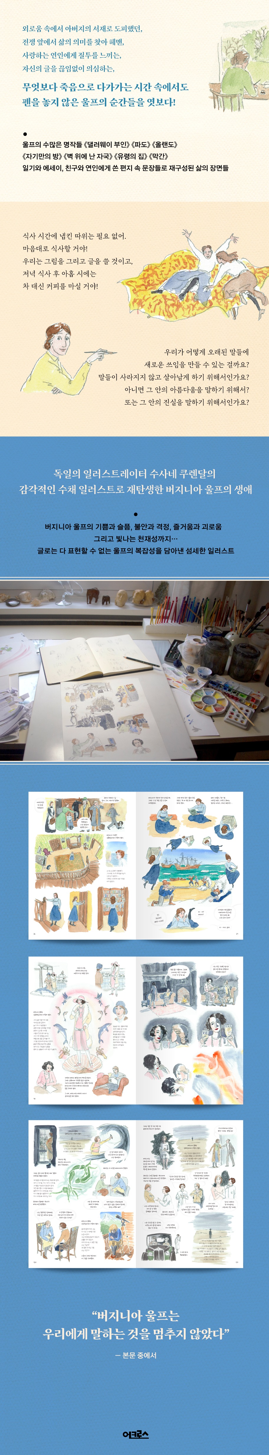저자는 버지니아 울프가 지나온 삶의 장면들과 울프가 쓴 글 속의 문장들을 정교하게 교차시키는 방식을 통해 이야기를 전개해 나간다. 페이지마다 《댈러웨이 부인》, 《등대로》, 《자기만의 방》, 《세월》 등 버지니아 울프의 대표작을 비롯한 여러 문학 작품과 에세이, 편지, 일기 등을 다채롭게 인용하고 있다. 또한 뜨겁게 사랑했던 연인이자 깊은 우정을 나눈 비타 색빌웨스트, 영혼의 동반자인 레너드 울프, 동시대를 살았던 예술가인 리턴 스트레이치, 덩컨 그랜트, 에드워드 모건 포스터, 캐서린 맨스필드 등과의 교류를 통해 울프의 사고가 확장되어 가는 모습이 입체적으로 펼쳐진다. 작가 ‘버지니아 울프’뿐 아니라 인간 버지니아 울프의 복잡성을 이해하게 되면서 그의 삶과 작품 세계가 얼마나 긴밀하게 얽혀 있는지 깨닫게 된다. 이 책은 버지니아 울프를 애정하는 독자는 물론 그를 제대로 알고 싶어 하는 초보 독자에게도 더없이 값질 것이다.